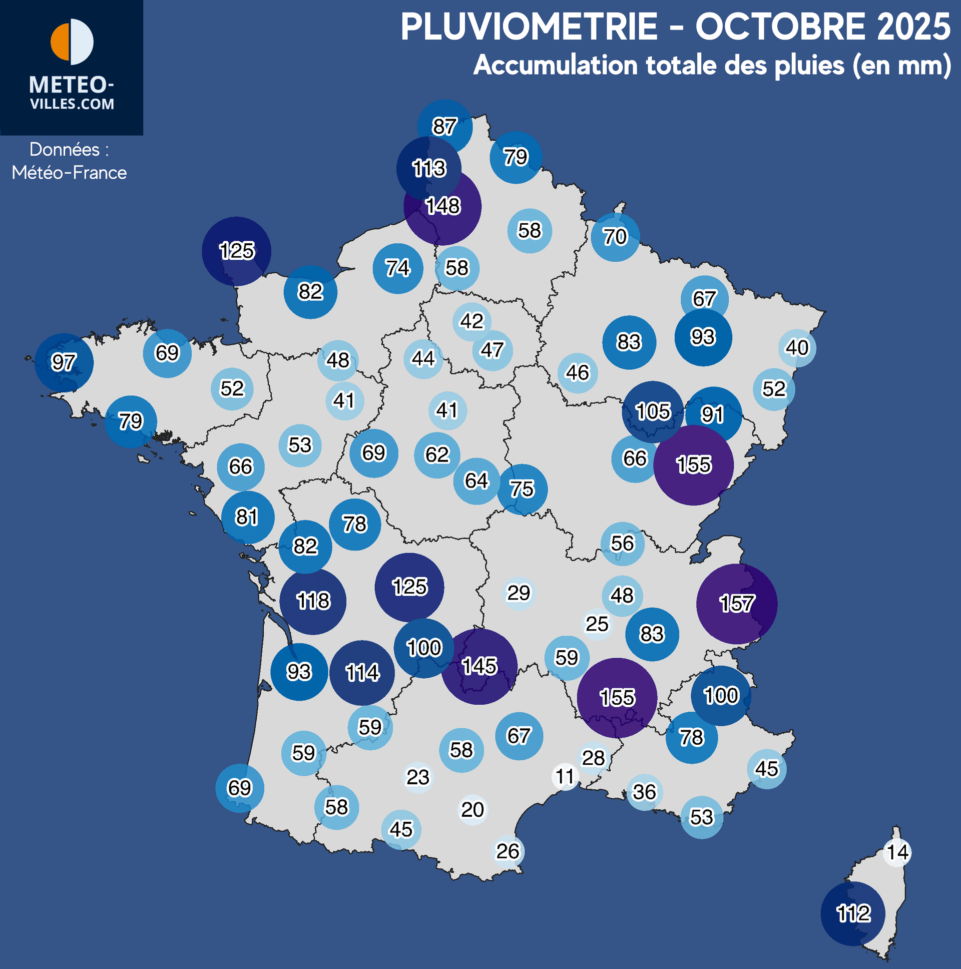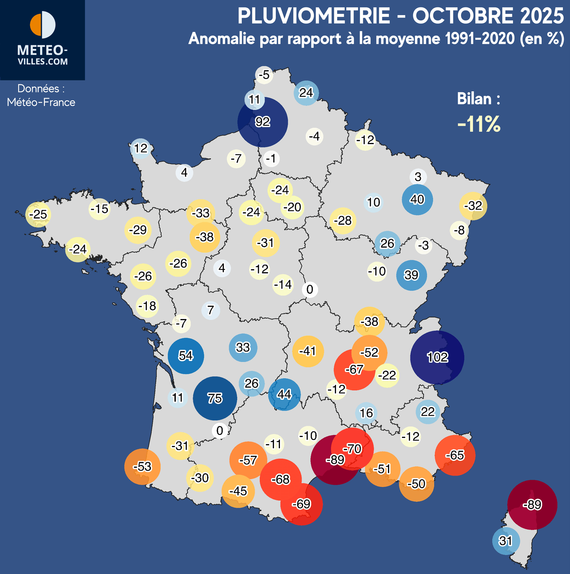 Certaines régions ont en effet été relativement épargnées par les précipitations avec un cumul par endroit largement sous les moyennes habituelles. C'est le cas sur une bande allant de la Bretagne au Bassin Parisien (-20 à -40%), sur l'Auvergne et la vallée du Rhône (jusqu'à -52% à Lyon, -67% à St-Etienne), mais également sur tout l'extrême sud du pays et plus principalement sur les bords de la Méditerranée (-69% à Perpignan, -70% à Nîmes, -89% à Montpellier et Bastia). Le littoral Audois et Héraultais a même vécu un mois très sec avec un déficit qui franchi les -90% (-94% au Cap d'Agde et -96% à Béziers-Courtade).