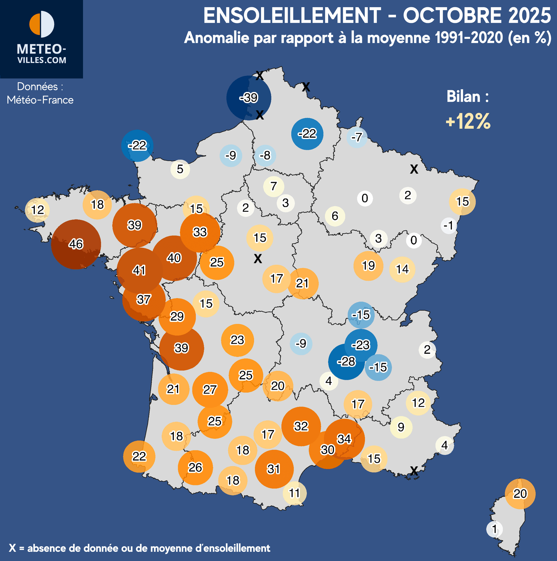 Comme à chaque début de mois, nous vous proposons un nouveau bilan climatologique. Place désormais au bilan cartographié d'OCTOBRE 2025 en termes de température, pluviométrie et ensoleillement sur un panel de 73 stations*. Les anomalies présentées sont calculées à partir des moyennes climatiques de la période de référence 1991-2020 sur l'ensemble des stations du panel.
