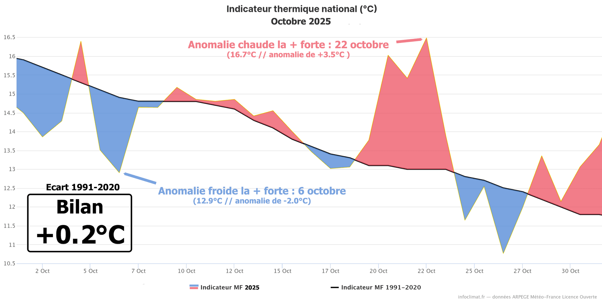 Évolution des températures quotidiennes en France durant octobre 2025 et écart à la moyenne 1991-2020 - Infoclimat