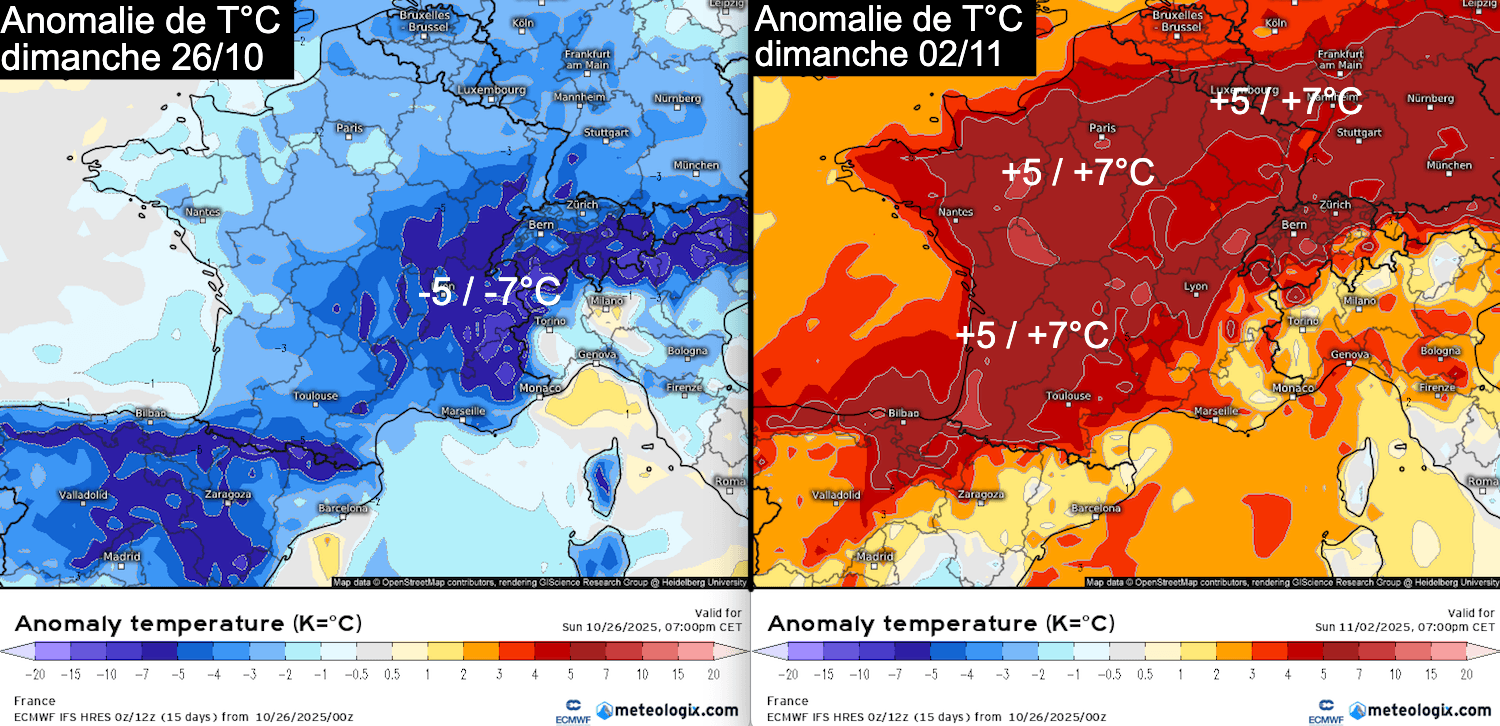 La journée de dimanche a constitué le pic de fraîcheur de cet épisode, avec des températures de 3 à 5 °C en dessous des valeurs habituelles pour une fin octobre. Il convient de rappeler que cette fraîcheur restait très localisée : au même moment, une grande partie de la Russie, des régions arctiques, du centre du Canada et du nord-ouest de l’Afrique connaissaient des anomalies chaudes, comprises entre +5 et +15 °C par rapport aux moyennes saisonnières.
