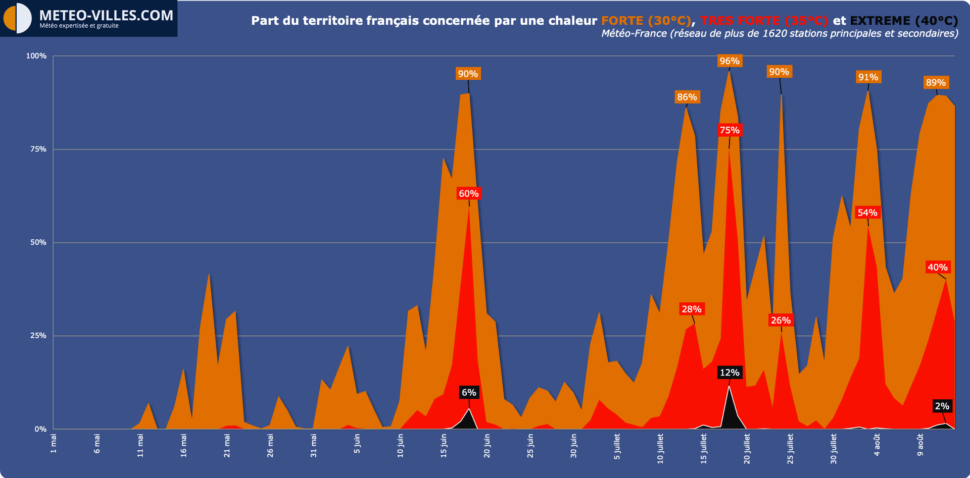 Part du territoire français concernée par une chaleur forte, très forte et extrême - du 1er mai au 13 août 2022 - Météo-Villes