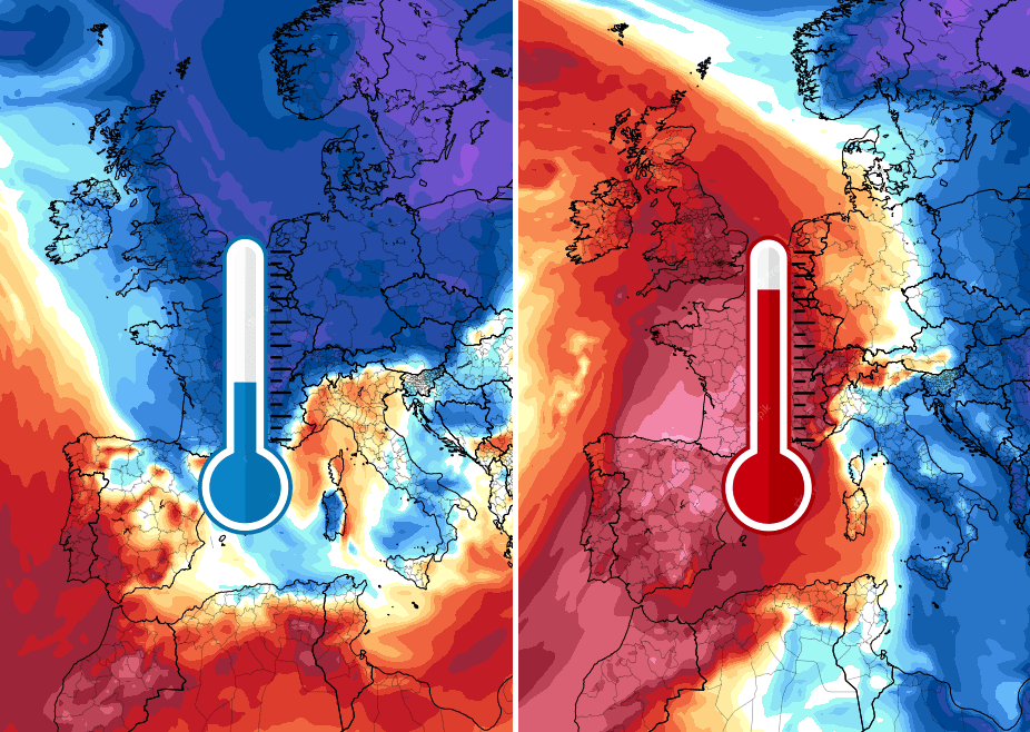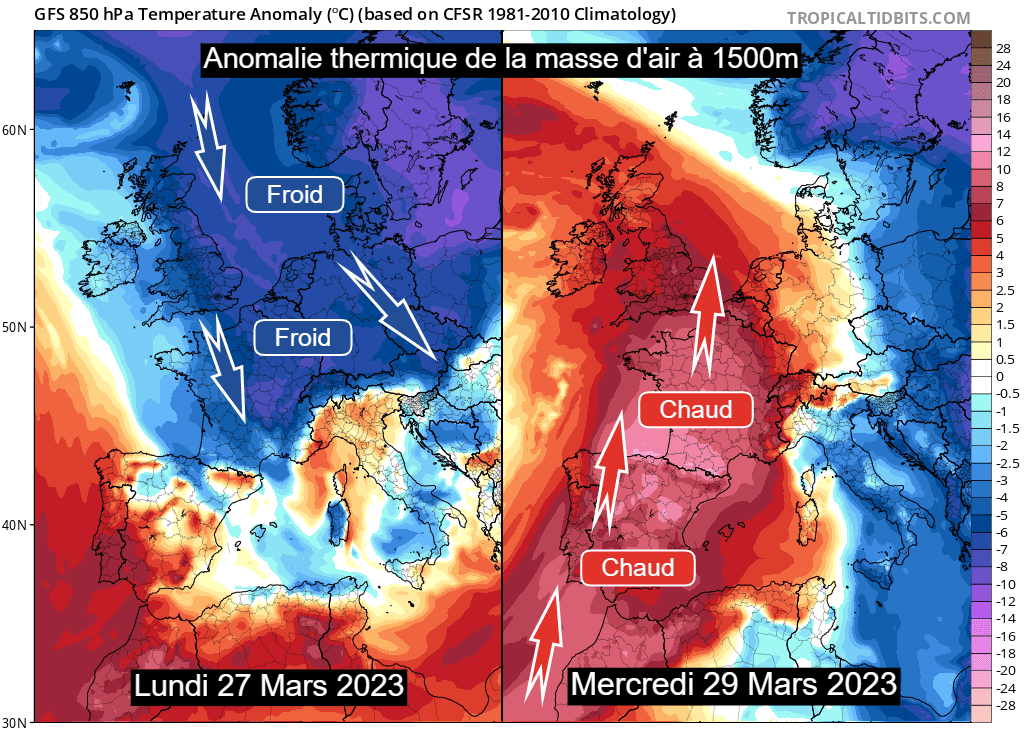 Cette première moitié de semaine est le théâtre d'impressionnants contrastes de températures ! Ce lundi 27 mars 2023, un flux de nord apportait une coulée d'air froid en provenance de Mer de Norvège. Ce mardi 28 mars, une dorsale issue de l'anticyclone des Açores s'étend sur la France et entraîne la bascule du flux au secteur sud à sud-ouest. Ce dernier a déjà fait remonter un air très doux sur le sud-ouest ce mardi, lequel envahira tout le pays ce mercredi 29 mars. En 48 heures, la température de la masse d'air à 1500m sera passée d'une anomalie de -3 à -6°C à une anomalie de +8 à +12°C !