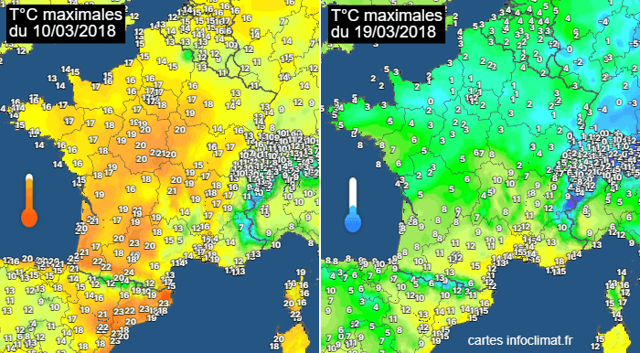 Températures maximales relevées les 10 et 19 mars 2018 - via infoclimat.fr