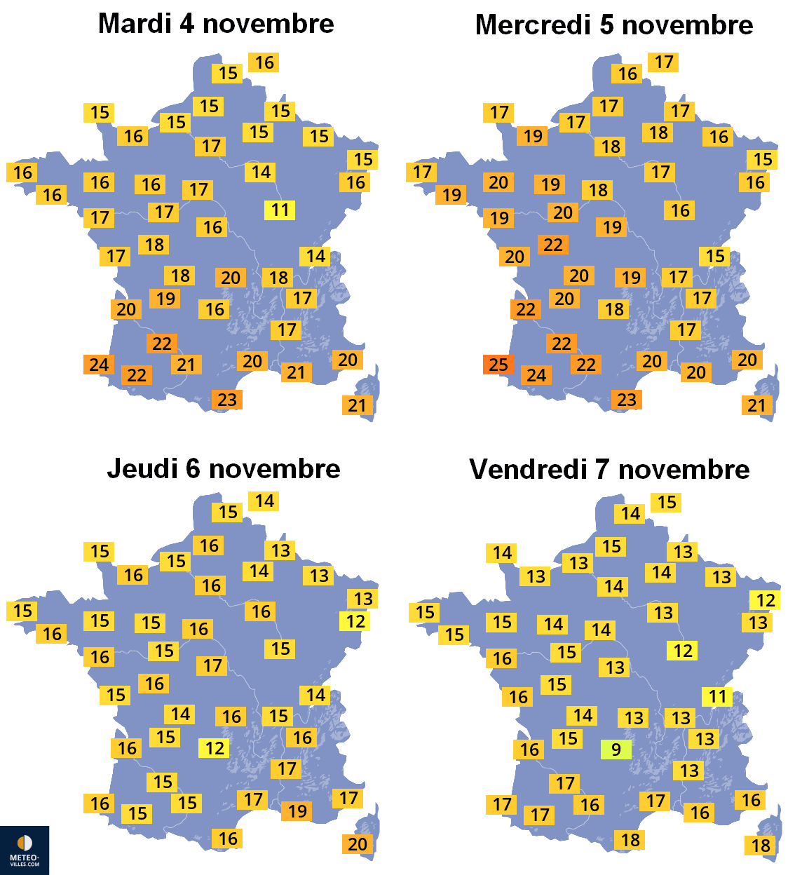 Evolution des températures sur la France du 4 au 7 novembre 2025 – Météo-Villes