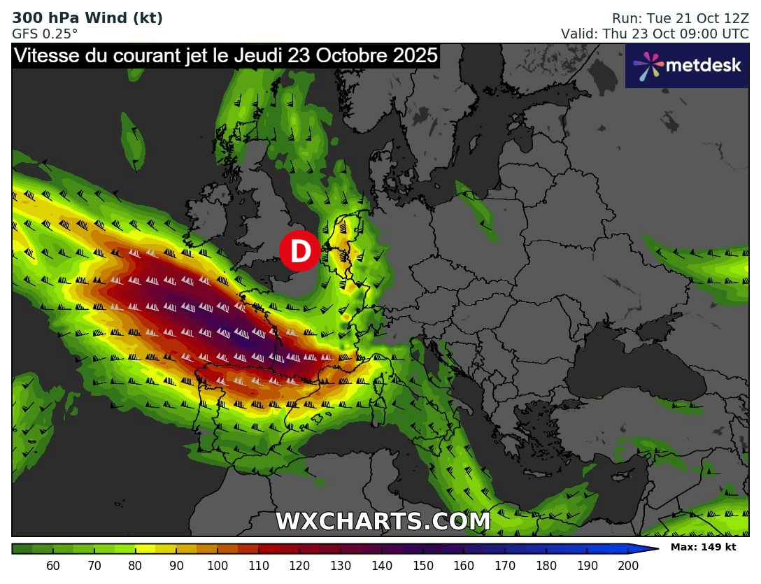 Si la dépression ne sera pas vraiment en phase avec le courant jet, ce dernier s'annonce très puissant au sud du creusement dépressionnaire. Ce jeudi 23 octobre 2025, le courant jet d'altitude avoisinera les 280 km/h (vers 9000 mètres d'altitude) sur le golfe de Gascogne. Ce puissant courant jet d'altitude est susceptible d'accentuer les rafales de vent qui toucheront la façade atlantique et les reliefs du sud, notamment lors du passage des averses.