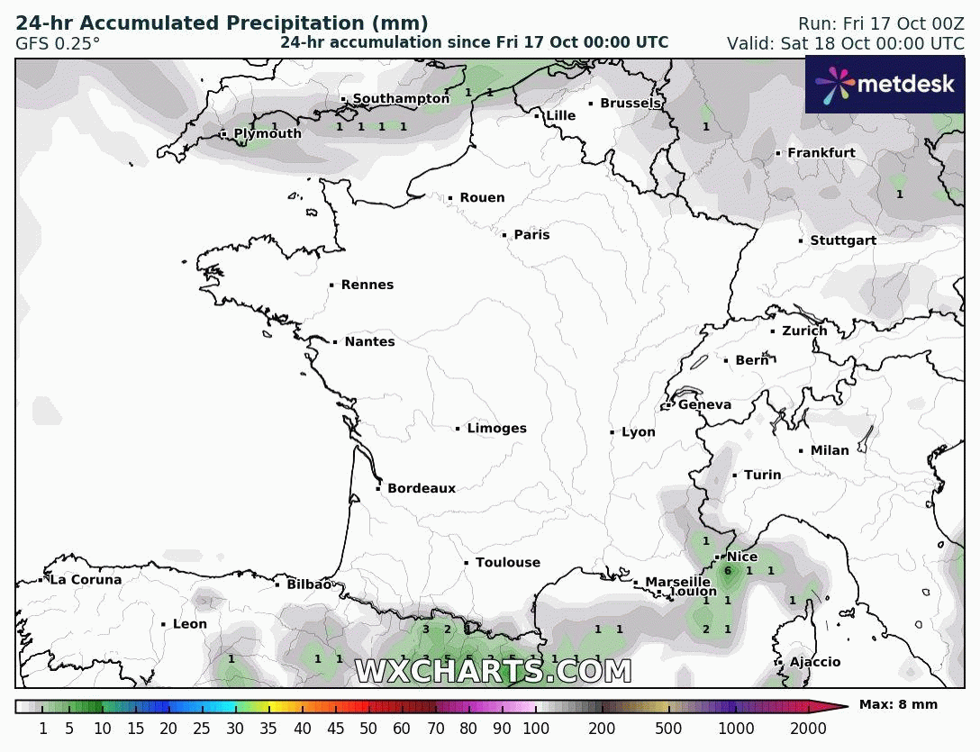 Ce temps perturbé et humide persistera ensuite tout au long de la semaine du 20 au 26 octobre avec une succession de fronts pluvieux sur le pays. Seules les régions méditerranéennes pourraient rester plus à l'écart après le passage frontal du lundi 20 octobre.