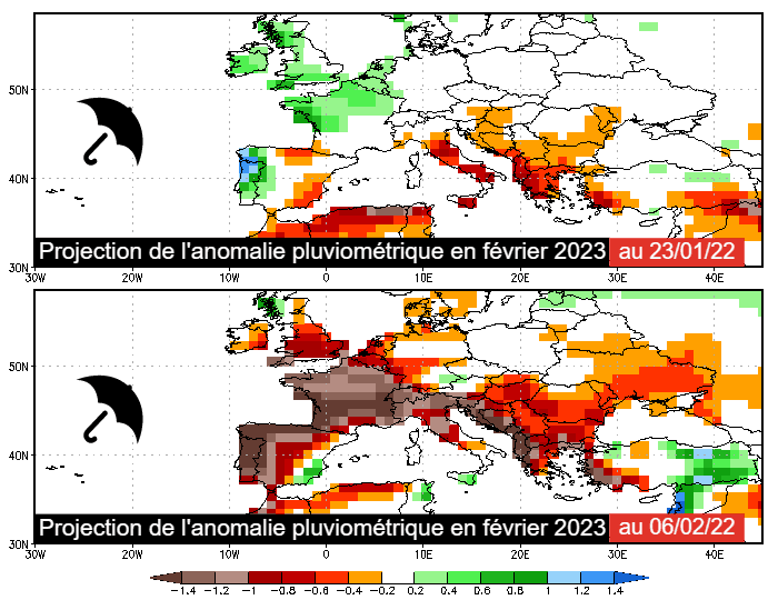 Modélisation de l'anomalie pluviométrique de février 2023 en date du 23 janvier et du 6 février - cartes NOAA
