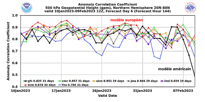 Indice de fiabilité des différents modèles de prévision depuis le 10 janvier 2023 - graphique NOAA