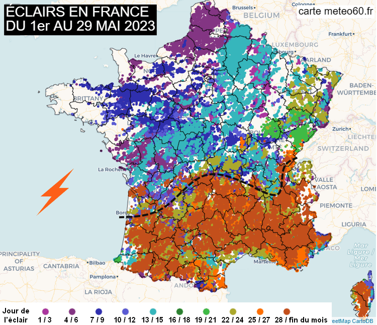 Éclairs détectés en France entre le 1er et le 29 mai 2023 - carte meteo60.fr