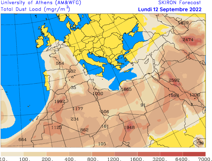 Concentration de sable saharien dans l'atmosphère ce lundi 12 septembre 2022 - via SKIRON