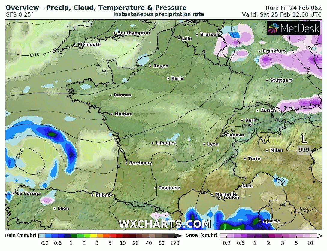 Animation du risque de pluie et de neige (violet) sur la France entre le 25 février et le 2 mars 2023 – Modèle GFS via WX CHARTS