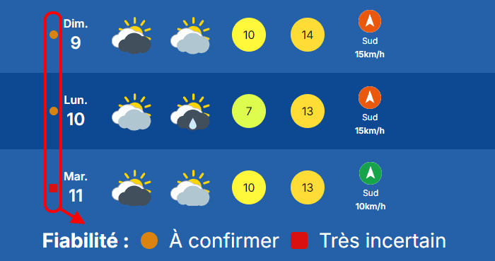 C'est pourquoi nous indiquons clairement les incertitudes dans nos tableaux de prévision. Elles sont matérialisées par de petits pictogrammes à la gauche des tableaux. Un rond orange signifie que le scénario reste à confirmer avec une incertitude modérée. Si les scénarios divergent fortement et que les incertitudes sont grandes, un carré rouge apparaît, témoignant d'une prévision très incertaine. Cette notion de transparence est essentielle car la météo n'est pas une science exacte. Les prévisions automatiques ne permettent pas d'évoquer cette incertitude et peuvent changer du tout au tout sans explications.