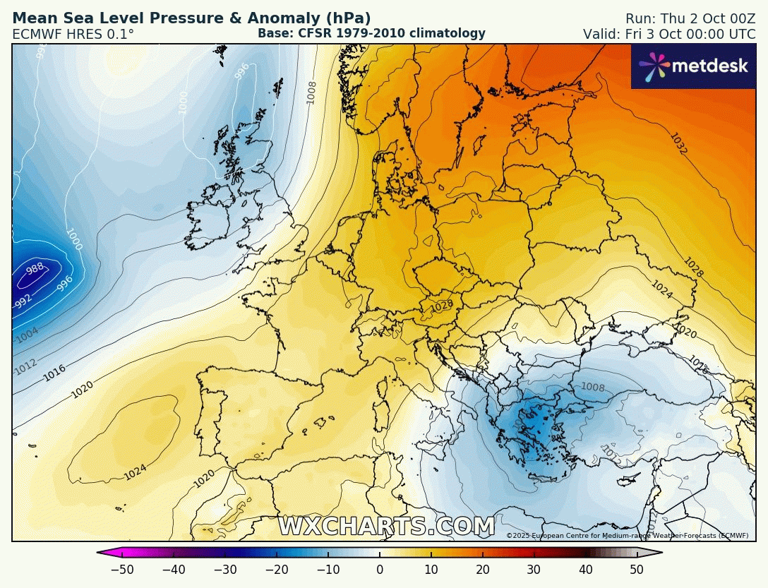 Tempête "explosive" Amy au nord des Îles Britanniques ce vendredi 3 octobre 2025 - wxcharts.com