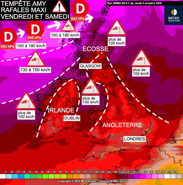 Boostée par un puissant courant jet en altitude, la tempête Amy s'annonce particulièrement virulente sur le nord des Îles Britanniques. Ce sont d'abord les côtes nord et l'ouest de l'Irlande qui subiront des rafales à plus de 100 km/h dès l'après-midi de vendredi mais les plus violentes rafales souffleront sur l'Écosse en soirée et jusqu'en nuit suivante. Elles pourront alors atteindre les 150 km/h sur les littoraux exposés et les hauteurs des Highlands ! En mer, des valeurs de 150 à 180 km/h sont modélisées !