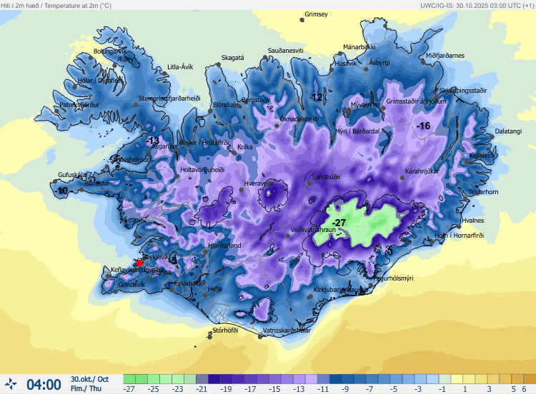 Avec le retour de nuits plus étoilées et des sols enneigés sur une grande partie du pays, l'Islande vit actuellement des nuits particulièrement froides. Ce matin du jeudi 30 octobre 2025, le thermomètre affiche -9°C à Reykjavik, une valeur qui se situe 10°C sous la normale d'une fin octobre (+1°C) ! Un peu plus dans les terres, à quelques kilomètres, des températures de -12 à -15°C sont enregistrées, descendant jusqu'à 15 degrés en dessous des normales de saison ! Toute l'île est en proie à un froid marqué avec jusqu'à -27°C dans les montagnes vers 2000 mètres.