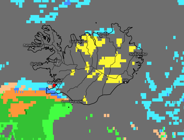 Nature des précipitations en Islande (vert = pluie, bleu = neige) le mardi 28 octobre 2025 - meteologix.com