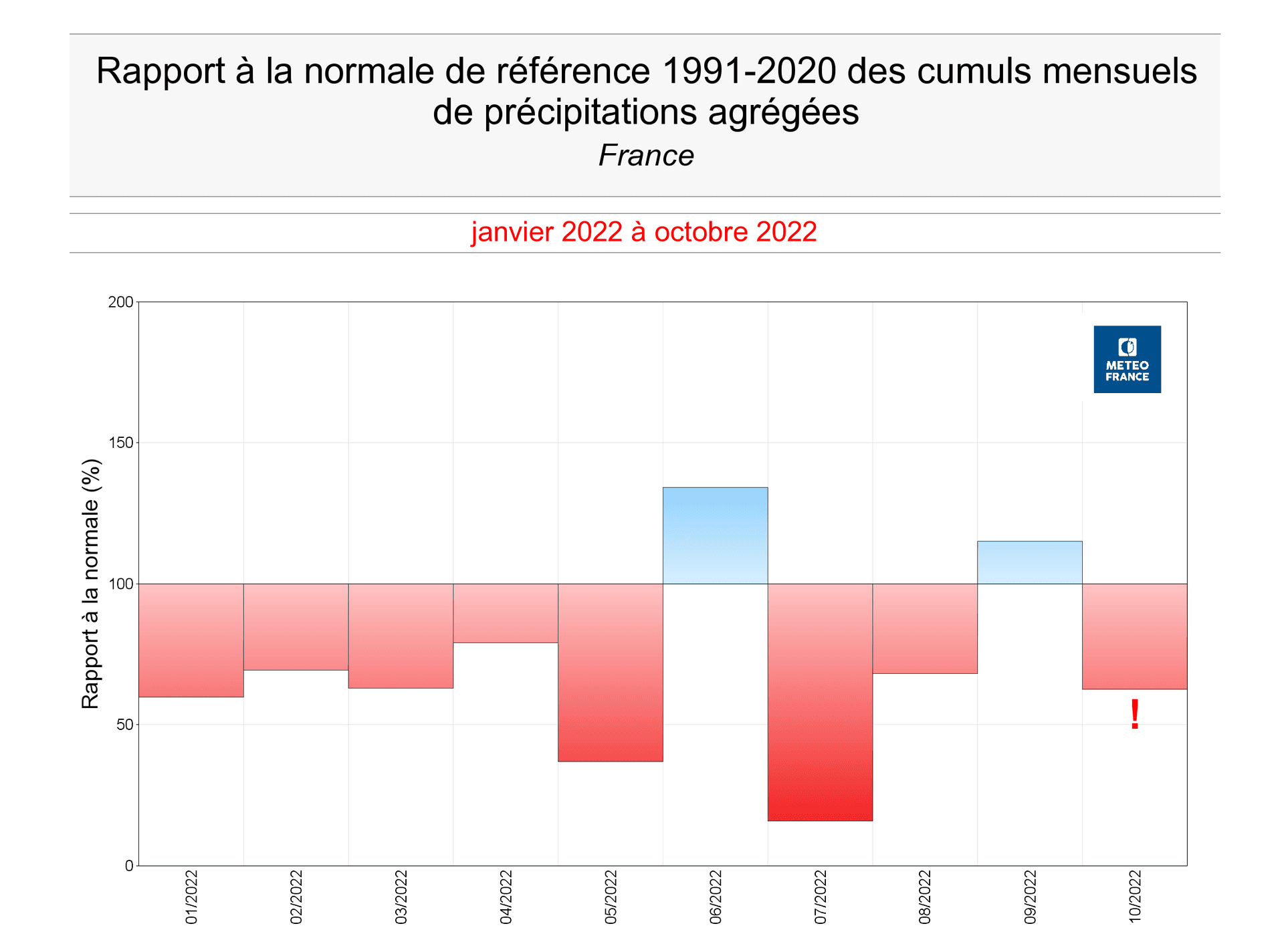 Anomalies pluviométriques mensuelles entre janvier et octobre 2022 – via Météo France