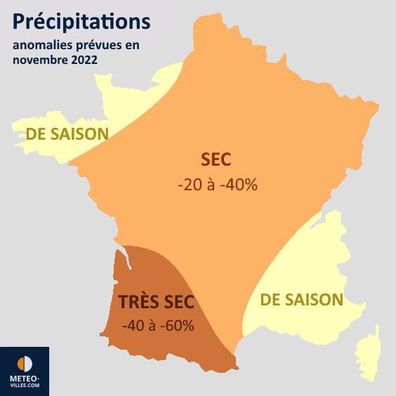 Si le début du mois s'annonce assez arrosé, cette anomalie humide devrait assez rapidement laisser place à une anomalie sèche. Ce mois de novembre 2022 semble donc s'annoncer plus sec que prévu, particulièrement dans le sud-ouest du pays où le déficit serait plus important. Les régions la Manche et le sud-est pourraient cependant enregistrer une pluviométrie plus proche de la normale.