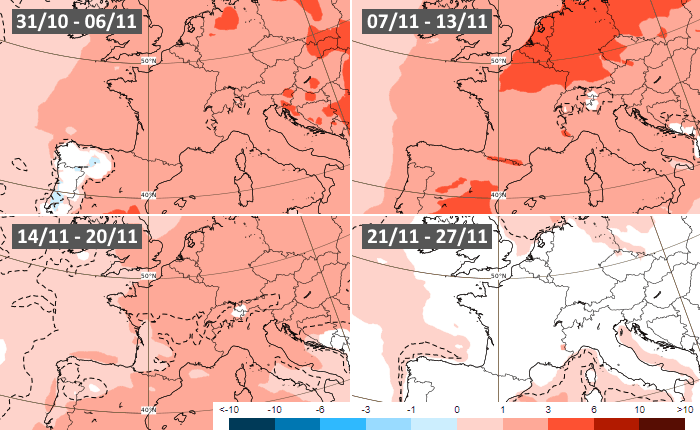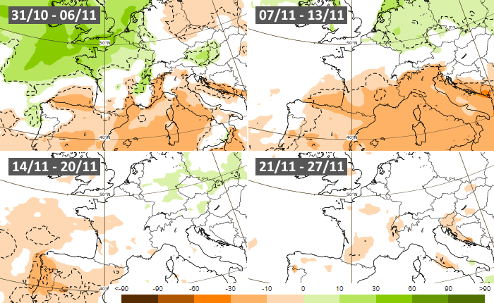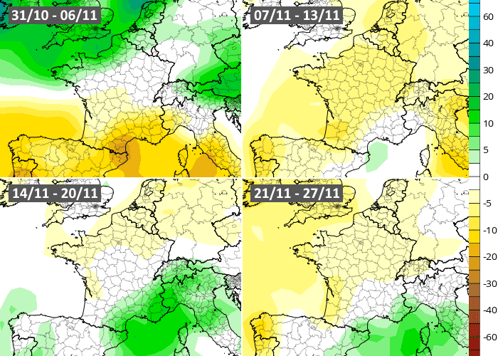 Les projections du modèle européen font ressortir le début de mois humide, notamment sur les régions du nord. Cette anomalie humide devrait rapidement s'estomper au cours de la semaine du 7 au 13 novembre, laissant place à un temps sec (notamment au sud). La seconde quinzaine de novembre devrait aussi présenter une tendance plus sèche que la normale, bien que celle-ci semble moins prononcée.