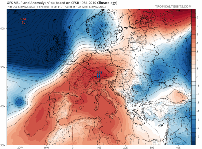 Anomalies de pression (bleu = dépressionnaire, rouge = anticyclonique) du 2 au 15 novembre 2022 – via tropicaltidbits.com