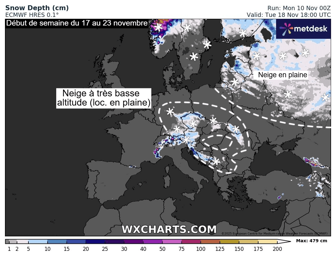Certains scénarios envisagent même le retour de la neige jusqu'à très basse altitude voire localement jusqu'en plaine sur une partie du continent dès la fin du week-end entre le centre et l'est du continent. Rien de remarquable cependant en cette période de l'année.