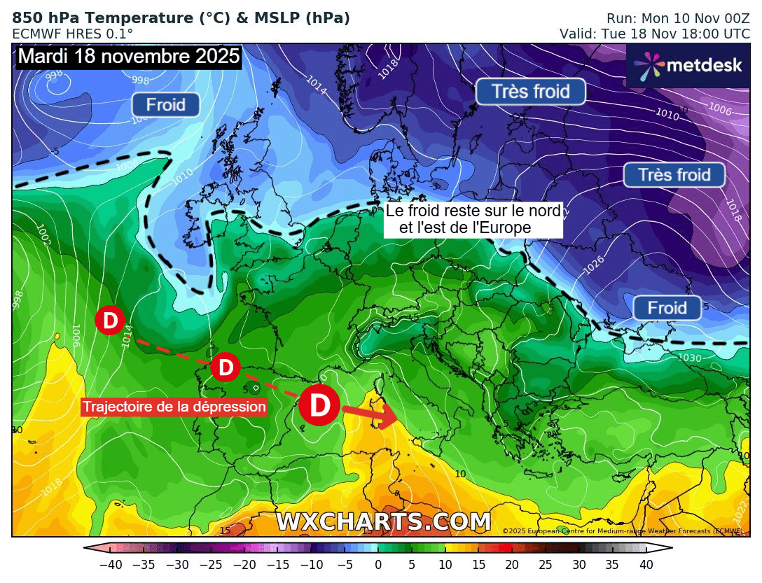 En effet, notre pays sera situé à la limite entre l'air froid plus à l'est et de l'air océanique plutôt frais et tout dépendra de l'évolution du creux dépressionnaire cité précédemment. Si celui-ci plonge vers l'Afrique, comme l'envisage le scénario du modèle GFS de ce lundi matin, alors de l'air plus froid pourra s'écouler sur la France par le nord de l'Europe avec le retour de conditions plus hivernales au moins temporairement.