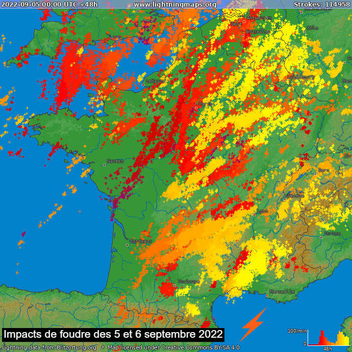 Selon le réseau Blitzortung, 29.950 éclairs ont été détectés en France le lundi 5 septembre 2022. La journée du mardi 6 septembre fut encore plus électrique avec un total impressionnant de 51.224 éclairs ! Ainsi, la France a comptabilisé 81.174 éclairs dans son ciel en l'espace de 48 heures ! Il conviendra d'ajouter à ce chiffre les dizaines de milliers d'éclairs supplémentaires enregistrés en cette journée du mercredi 7 septembre.