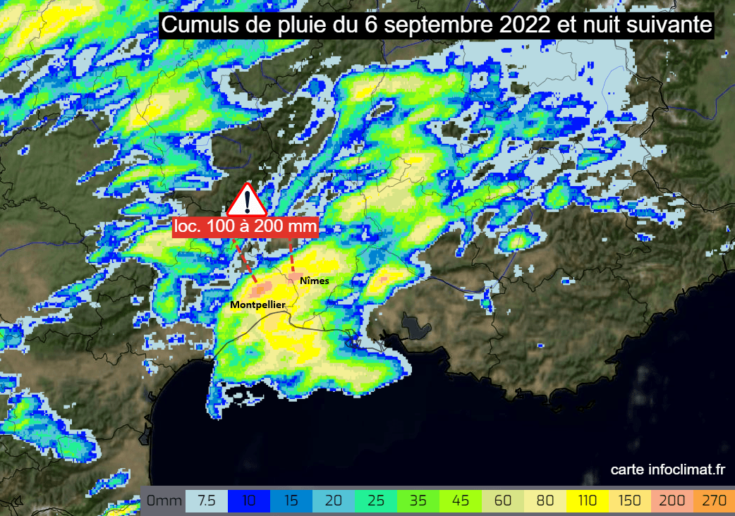 Deux orages diluviens se sont déclenchés sur le Languedoc durant la journée du mardi 6 septembre 2022. Le premier s'est formé dès le début de l’après-midi à la frontière entre Hérault et Gard avec une activité pluvieuse très importante au nord immédiat de Montpellier. Cet orage a déversé jusqu'à 133 mm à la station de Prades-le-Lez Le Viala (34) ! Le second a touché la région de Nîmes dans la nuit du 6 au 7 septembre 2022. Il a donné 76 mm à la station de Nîmes-Courbessac mais une station située dans les quartiers ouest de Nîmes a mesuré près de 130 mm en heures (dont 89 mm en une heure) !