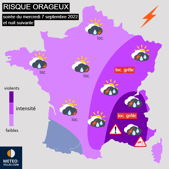 Les orages vont s'organiser dans le courant de la soirée de mercredi. Ils pourront être forts avec un risque de pluies intenses et de grêle de l'Auvergne vers le nord-est de la France. Toutefois, c'est dans le sud-est que sont prévus les orages les plus violents après la tombée de la nuit. Durant la nuit du 7 au 8 septembre 2022, une ligne orageuse devrait s'organiser à partir du sud-est du Massif Central, balayant la vallée du Rhône, les régions alpines et la région PACA. On redoute des pluies diluviennes avec risque d'inondations, des chutes de grêle de diamètre conséquents et des bourrasques de vent pouvant atteindre les 100 km/h. Par ailleurs, l'activité électrique s'annonce soutenue.